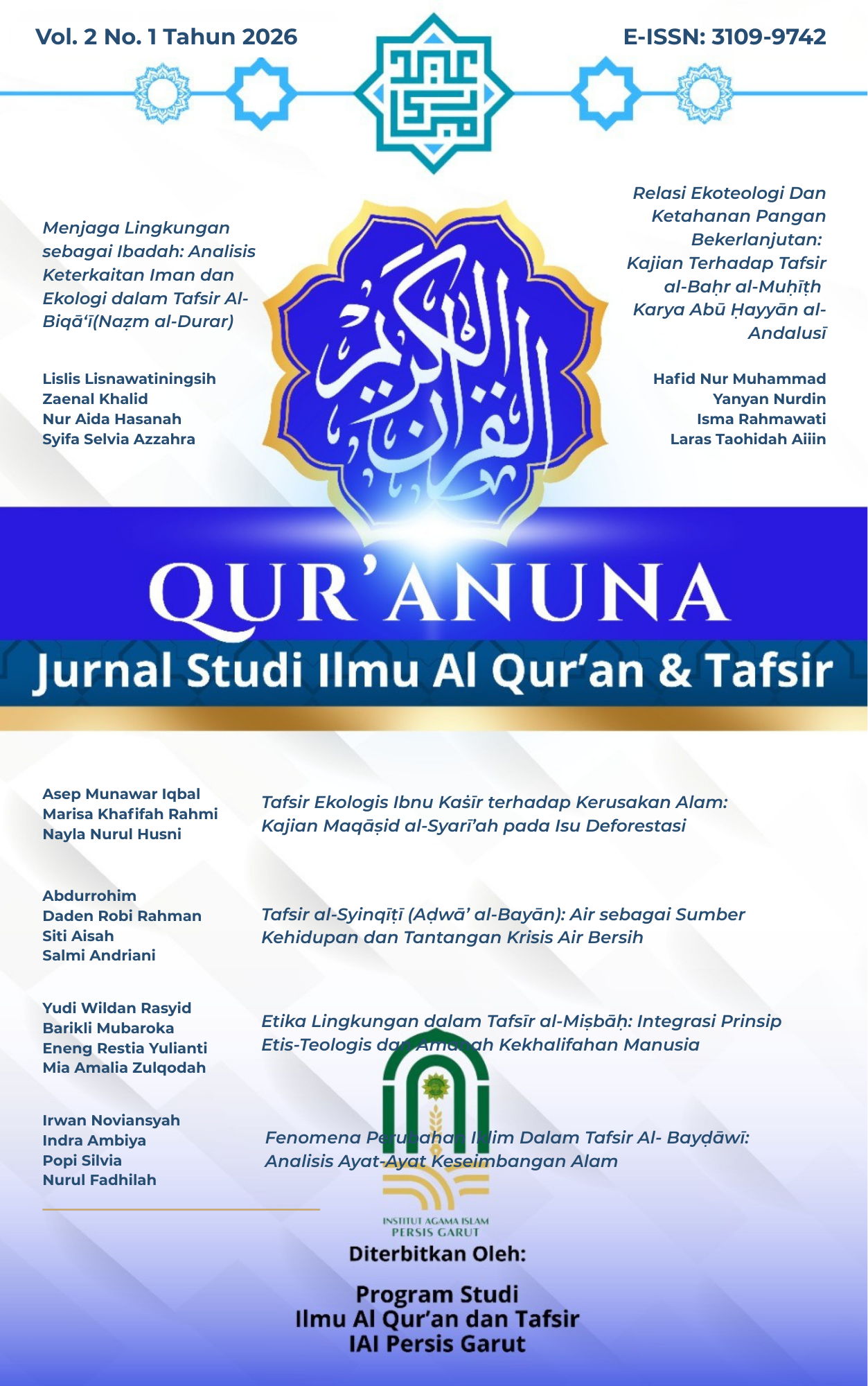 Qur’anuna: Jurnal Studi Ilmu Al-Qur’an dan Tafsir is a peer-reviewed academic journal published by the Department of Al-Qur'an Science and Tafsir (IAT), IAI PERSIS Garut. This journal serves as a strategic platform for scholars, researchers, and students to contribute original research and critical insights into the vast field of Qur'anic studies and Tafsir.